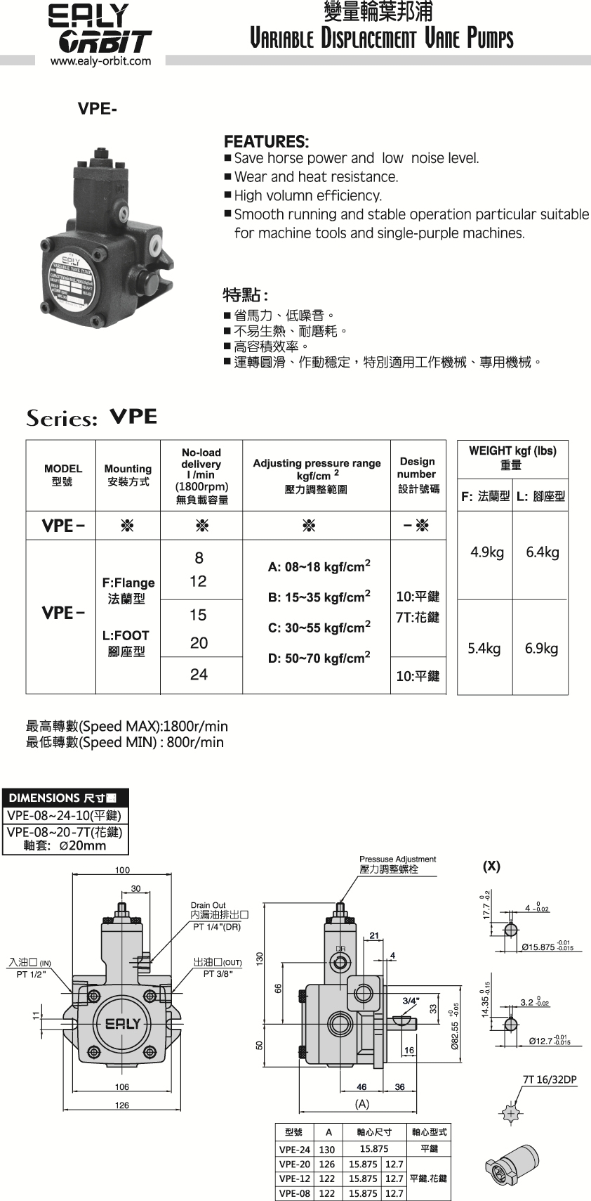 ELITEU油泵,ELITECO.,LTD电机马达,VP-20-F/A3,2HP 1.5KW 220/380 50Hz,VP-30-F/A3,3HP 2.2KW 220/380 50Hz,VP-40-F/A3,5HP 3.7KW 220/380 50Hz,