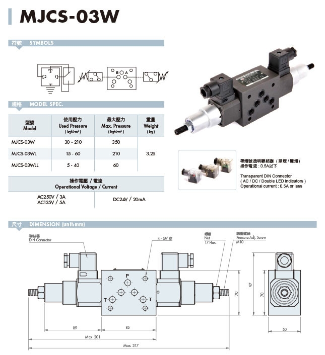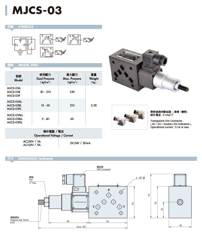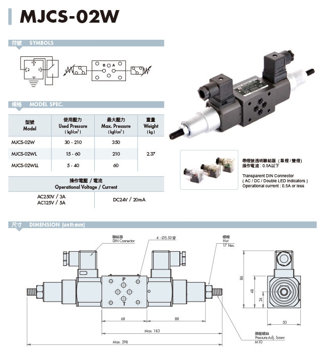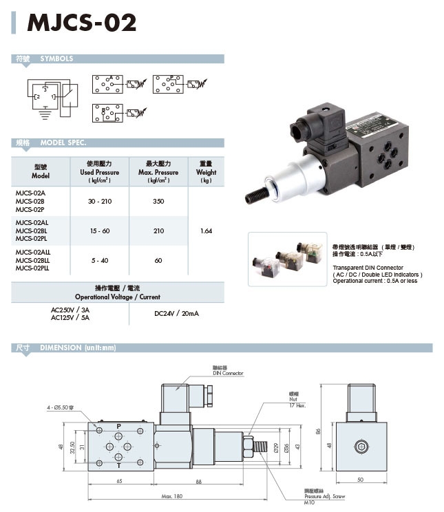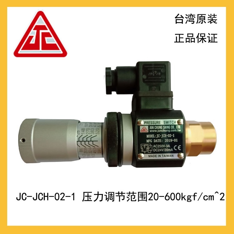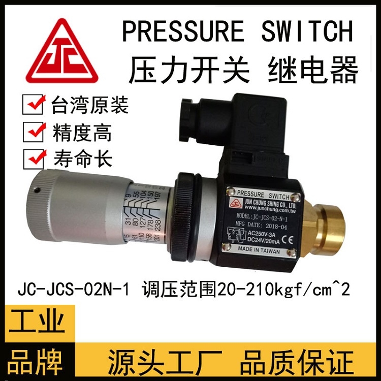 压力继电器JCS-02N内藏微动开关,感应来自液压系统的压力,传达电气信号给电磁换向阀或电气马达,使其改变切换方向或警告关闭油路,以达到系统安全的效果。